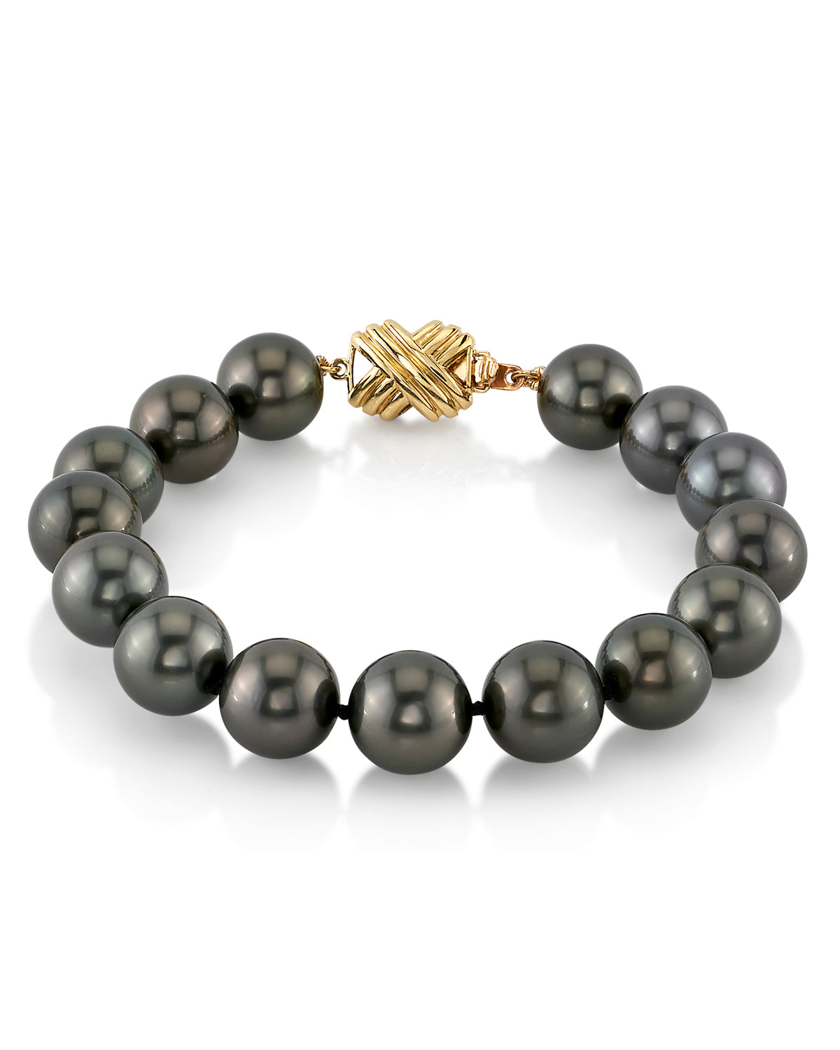 Adorn yourself with a stunning bracelet that captures the essence of elegance. This exquisite piece showcases Tahitian pearls in a mesmerizing palette of dark silver, steel, and subtle peacock colors. Featuring True-Round pearls ranging from 10.0-11.0mm in size, each pearl shines with bright, crisp luster against a backdrop of dark charcoal grey. Measuring at 7.5 inches, this AAAA Quality bracelet can be customized for a perfect fit, ensuring you wear a luxurious statement of sophistication.