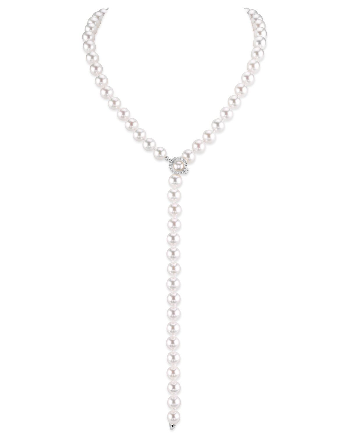 This exquisite lariat pearl necklace features 8.0-8.5mm AAA quality Japanese white Akoya pearls hand picked for their radiant luster. The pearls are strung and double knotted on the finest silk thread. The necklace is affixed with an adjustable 14K gold and diamond encrusted clasp that can be placed on any pearl on the strand for easy customization.