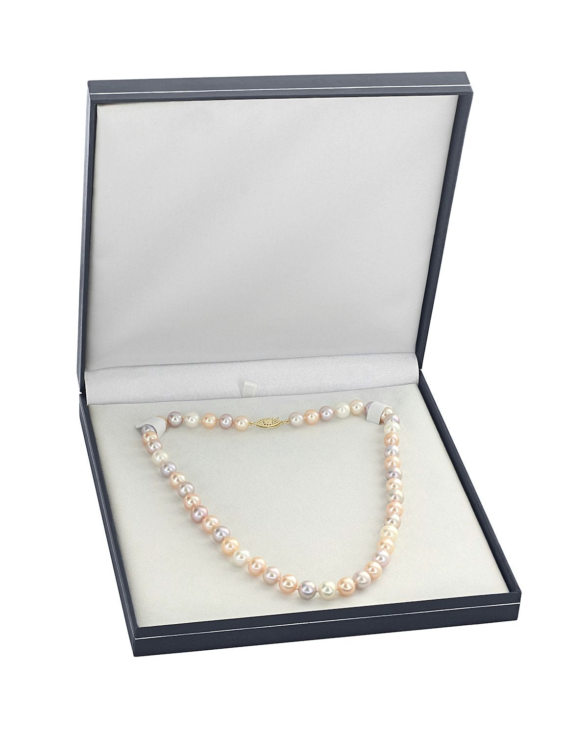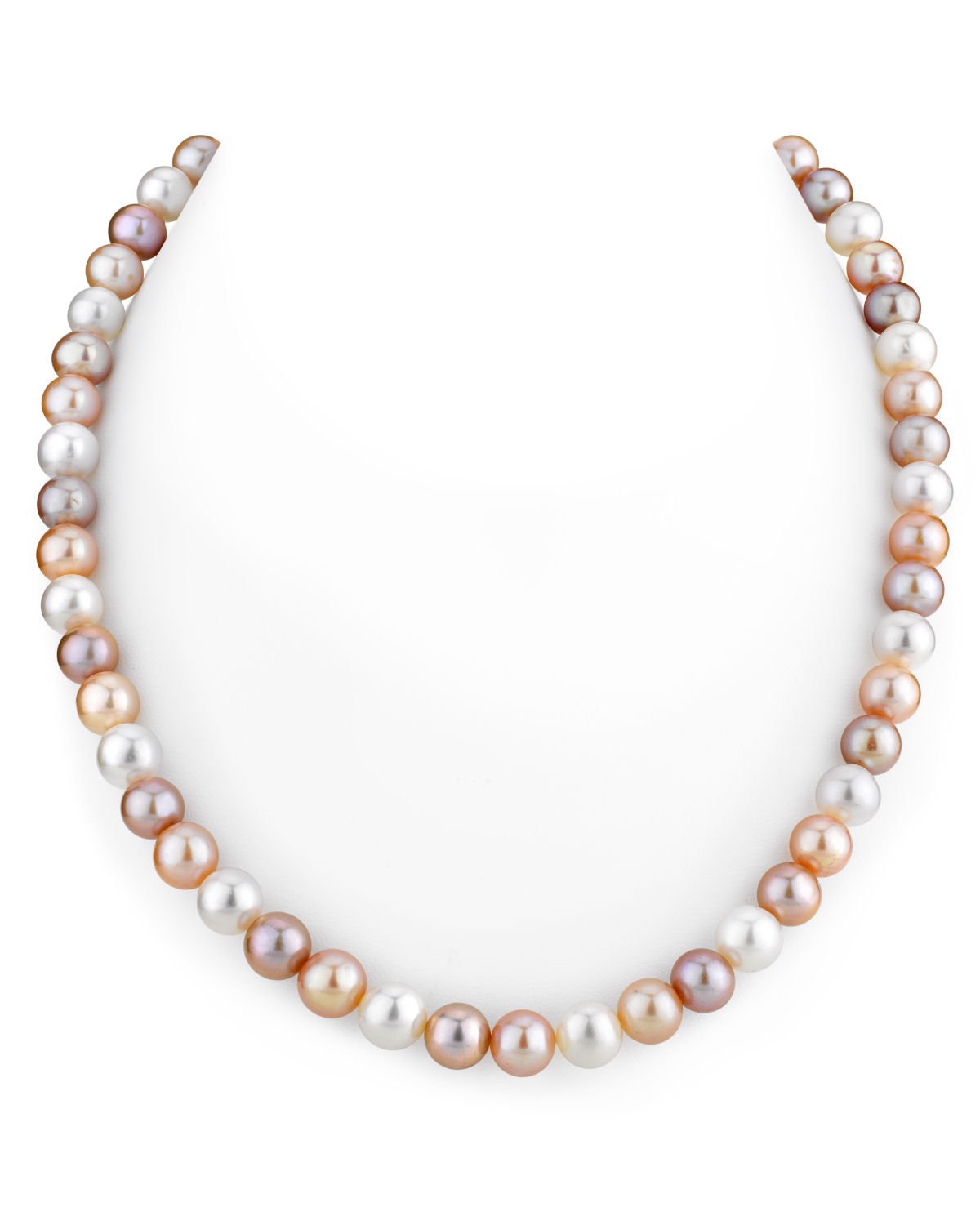 This necklace is a gorgeous 8.0-8.5mm Freshwater Multicolor strand that includes a gorgeous variety of colors including lavender, peach, and white. AAA in quality, these pearls have sharp luster and more uniformly round pearls.
