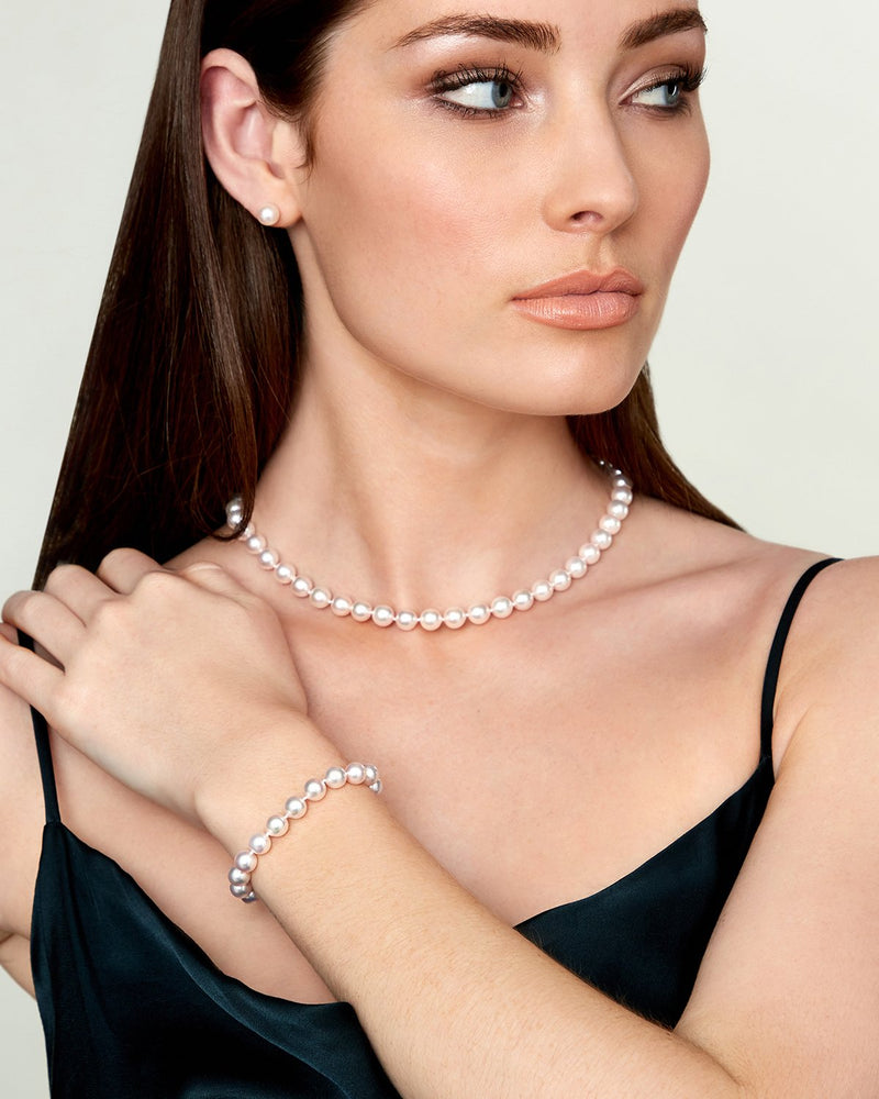 Elevate your jewelry collection with this exquisite set featuring stunning white pearls that capture the essence of refined elegance. Each piece showcases AAA quality Japanese Akoya pearls, renowned for their perfectly round shapes, captivating pastel overtones, and exceptional luster. Whether you choose a 16, 18, or 20-inch necklace, a 7.5-inch bracelet, or matching stud earrings, this versatile set will complement any outfit, making it a perennial favorite among our customers.